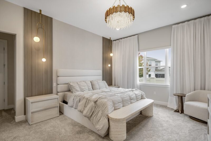 This primary bathroom was designed as a calm sanctuary where modern lines meet warm, livable
