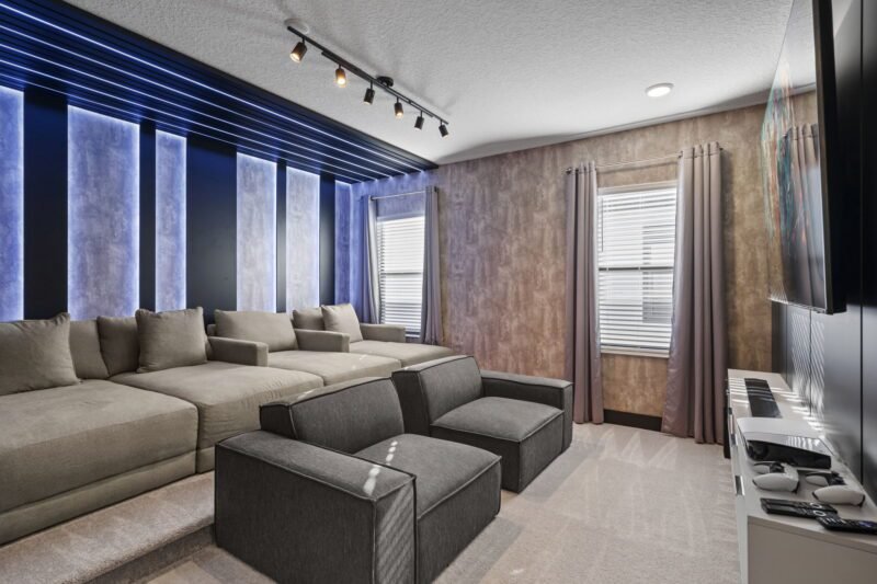 This stunning home theater was meticulously designed to accommodate a large number of guests