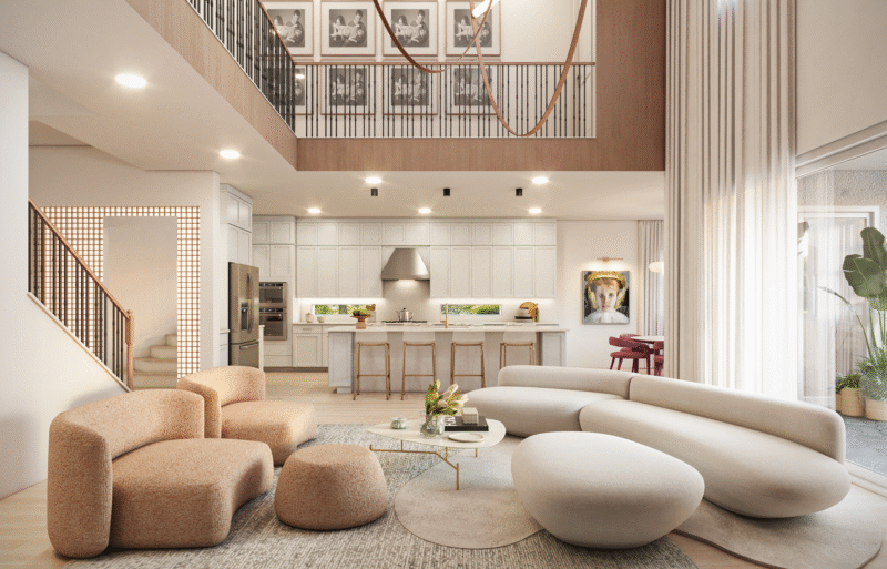 This double-height room embraces open-plan living with a sense of vertical grandeur and airiness. Its