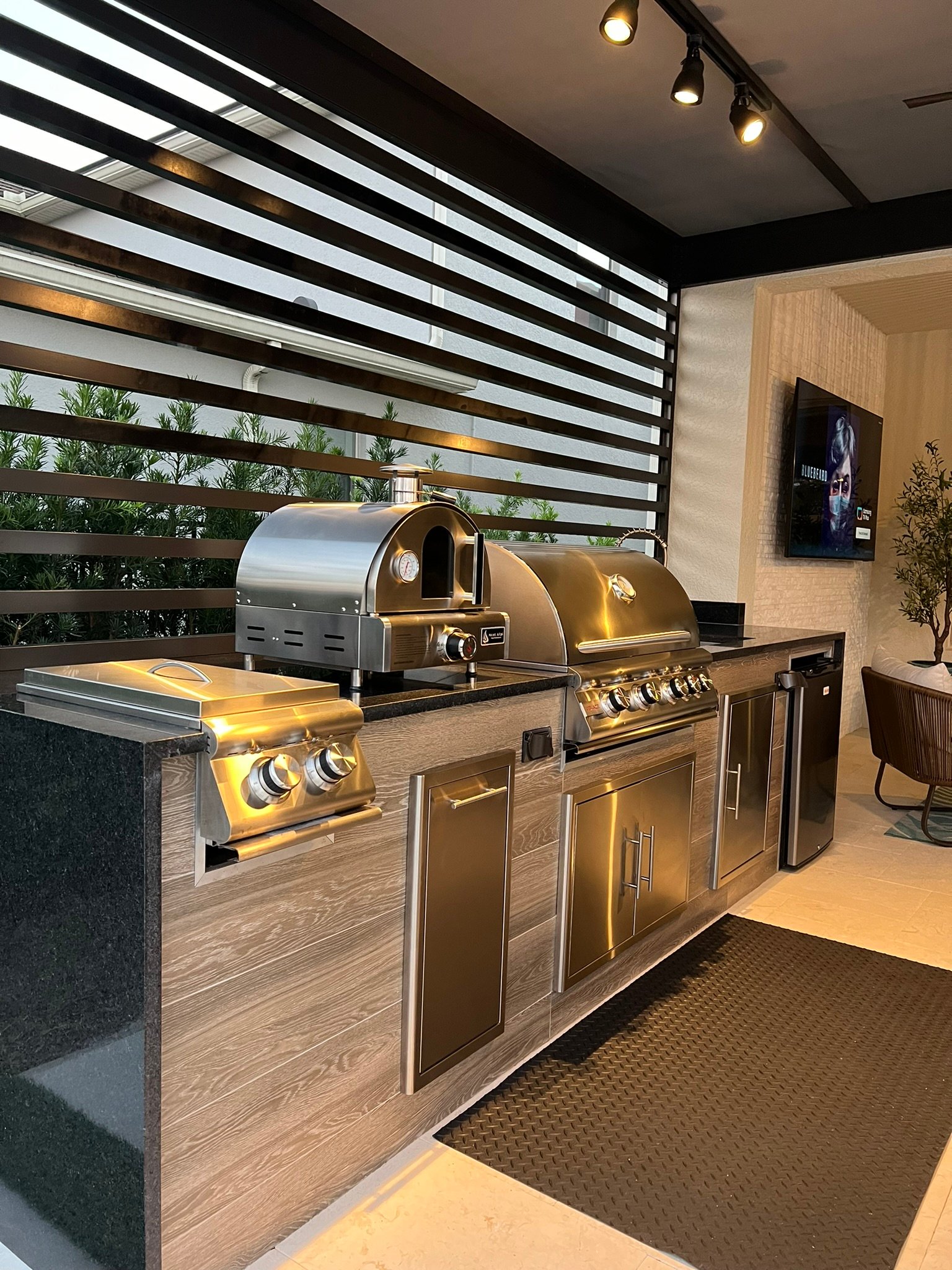 In this stunning project, a radiant pool takes center stage, surrounded by a sunken fire pit with illuminated steps, creating a cozy atmosphere for warm evenings. The summer kitchen, custom-designed for entertaining enthusiasts, transforms every meal into a celebration. With natural stone flooring, the space exudes sophistication, and the colors and materials intertwine beautifully with the breathtaking landscape. It’s the perfect setting to enjoy unforgettable moments with friends and family under the starry sky.