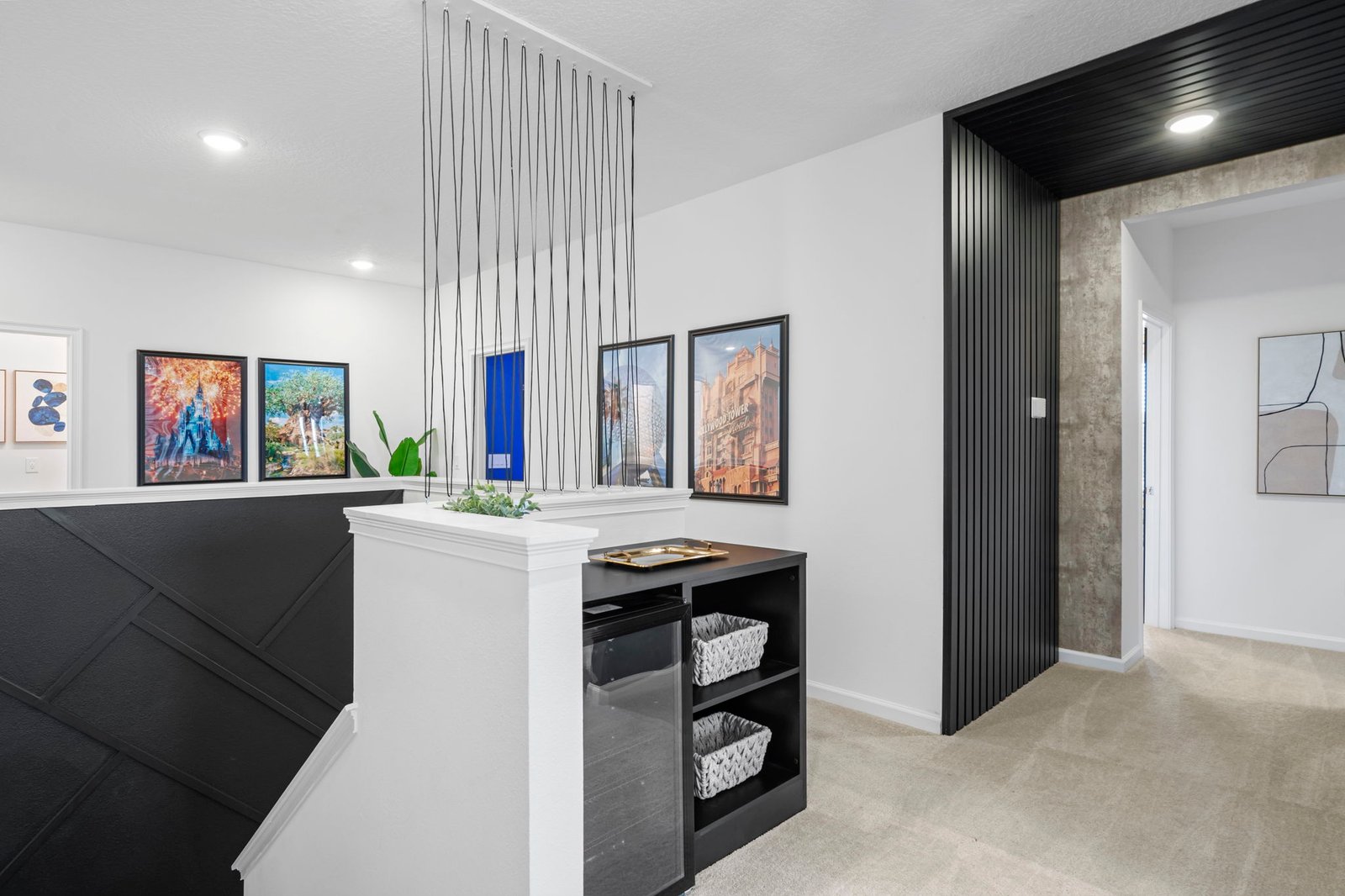Adjacent to the main space, a sleek built-in refreshment station includes a designer mini fridge, open shelving with woven baskets, and a curated tray setup—perfect for effortless entertaining. Matte black vertical slats and luxurious textured walls elevate the transition areas, tying the space together with bold sophistication.