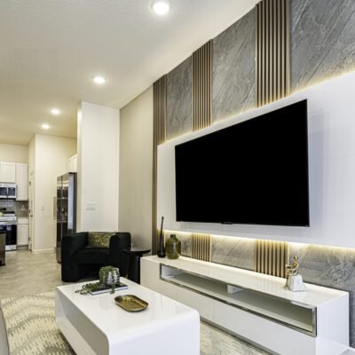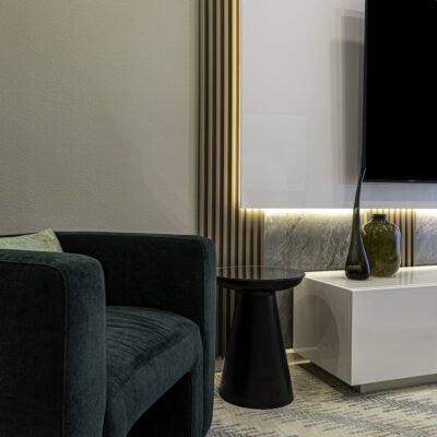 The TV wall serves as a sculptural focal point, combining marble-effect panels with vertical wooden slats and integrated LED lighting. This thoughtful blend of textures — warm wood, cool marble, and soft lacquer — expresses the project’s goal: a visually calm space with identity and sophistication.