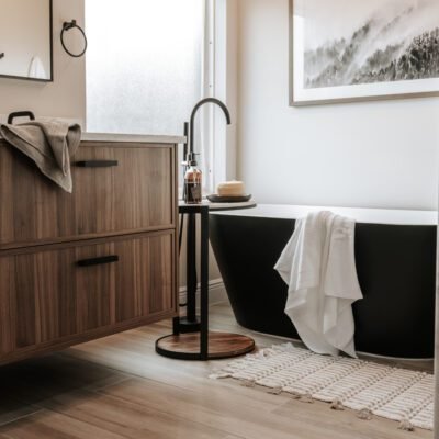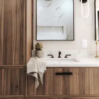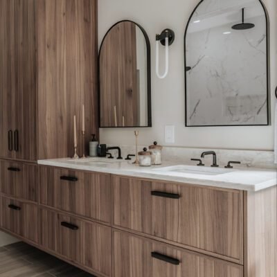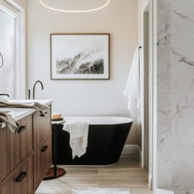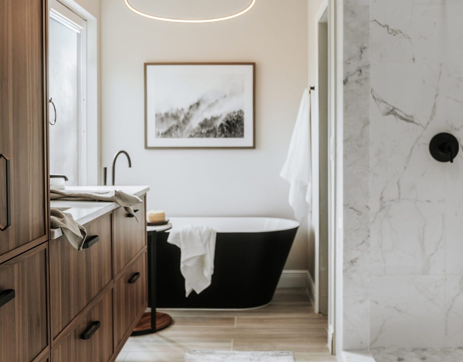 This primary bathroom was designed as a calm sanctuary where modern lines meet warm, livable texture. A sculptural LED halo sets the tone above a matte-black soaking tub, creating a gentle glow that invites quiet moments of pause. Natural light filters through the window and washes over a palette of creamy walls, walnut cabinetry, and stone surfaces, softening every edge. The custom vanity provides generous storage with clean, furniture-style drawers and black hardware, while an arched mirror and streamlined fixtures keep the composition effortless.