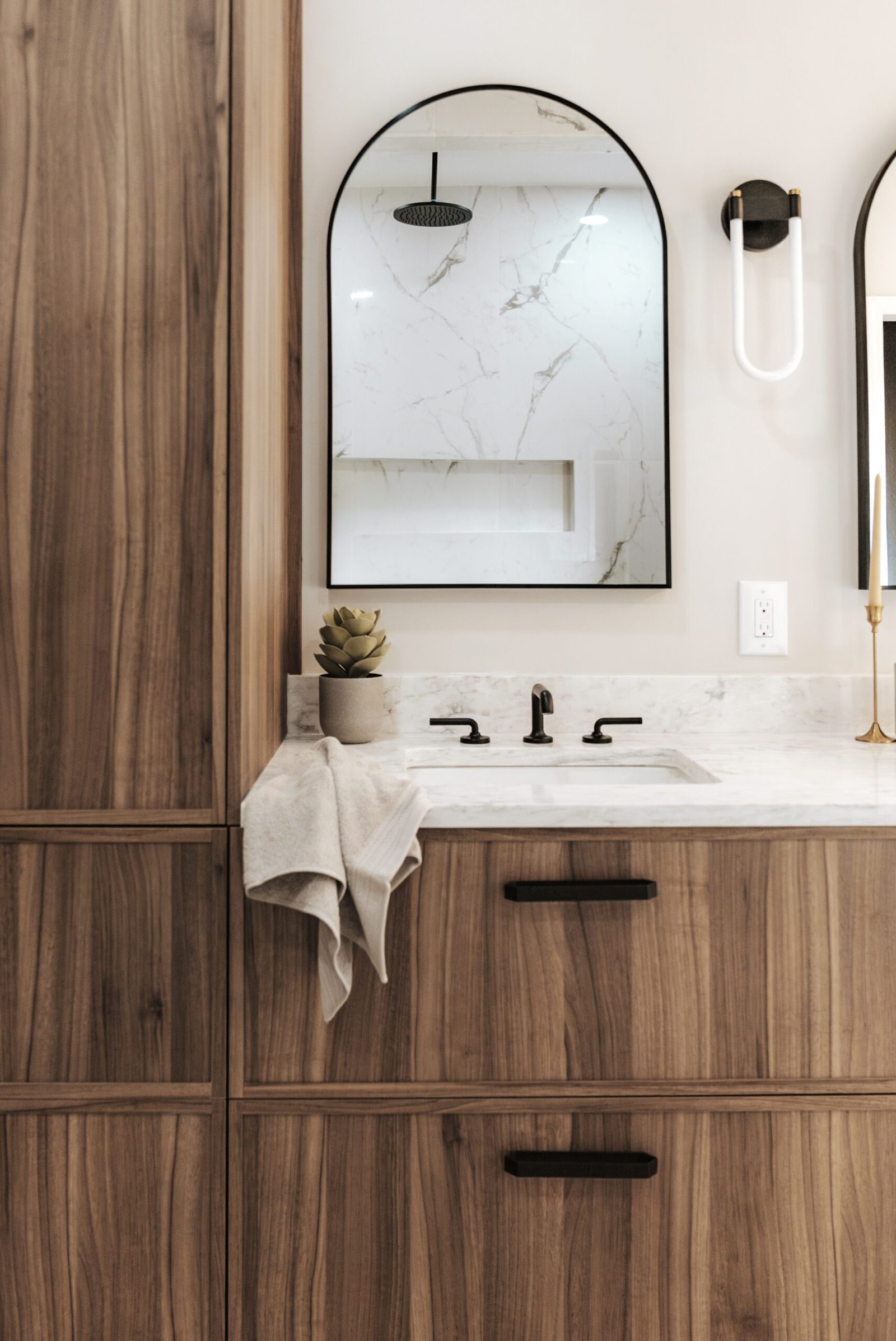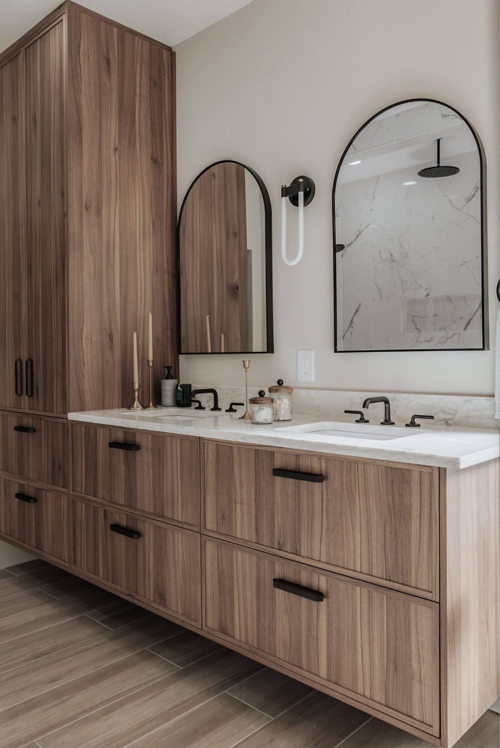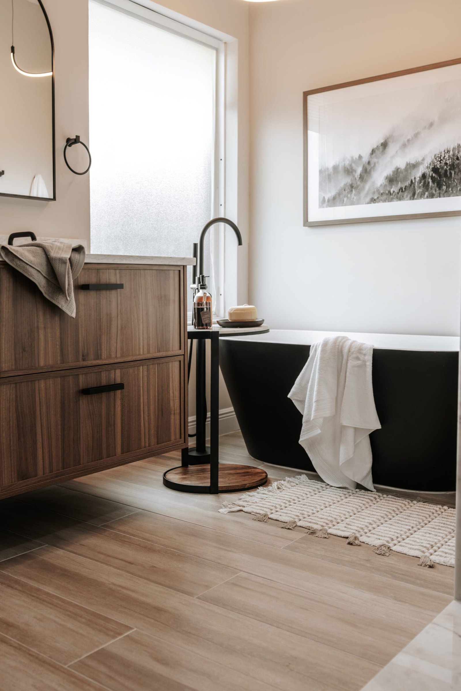This primary bathroom was designed as a calm sanctuary where modern lines meet warm, livable texture. A sculptural LED halo sets the tone above a matte-black soaking tub, creating a gentle glow that invites quiet moments of pause. Natural light filters through the window and washes over a palette of creamy walls, walnut cabinetry, and stone surfaces, softening every edge. The custom vanity provides generous storage with clean, furniture-style drawers and black hardware, while an arched mirror and streamlined fixtures keep the composition effortless.
