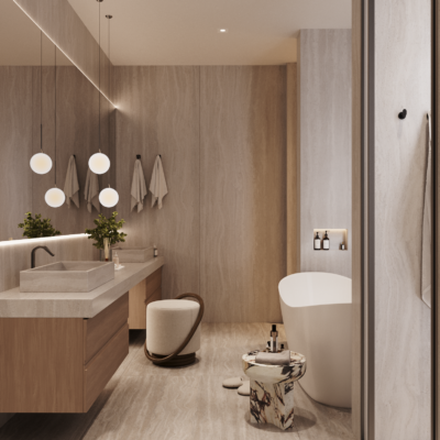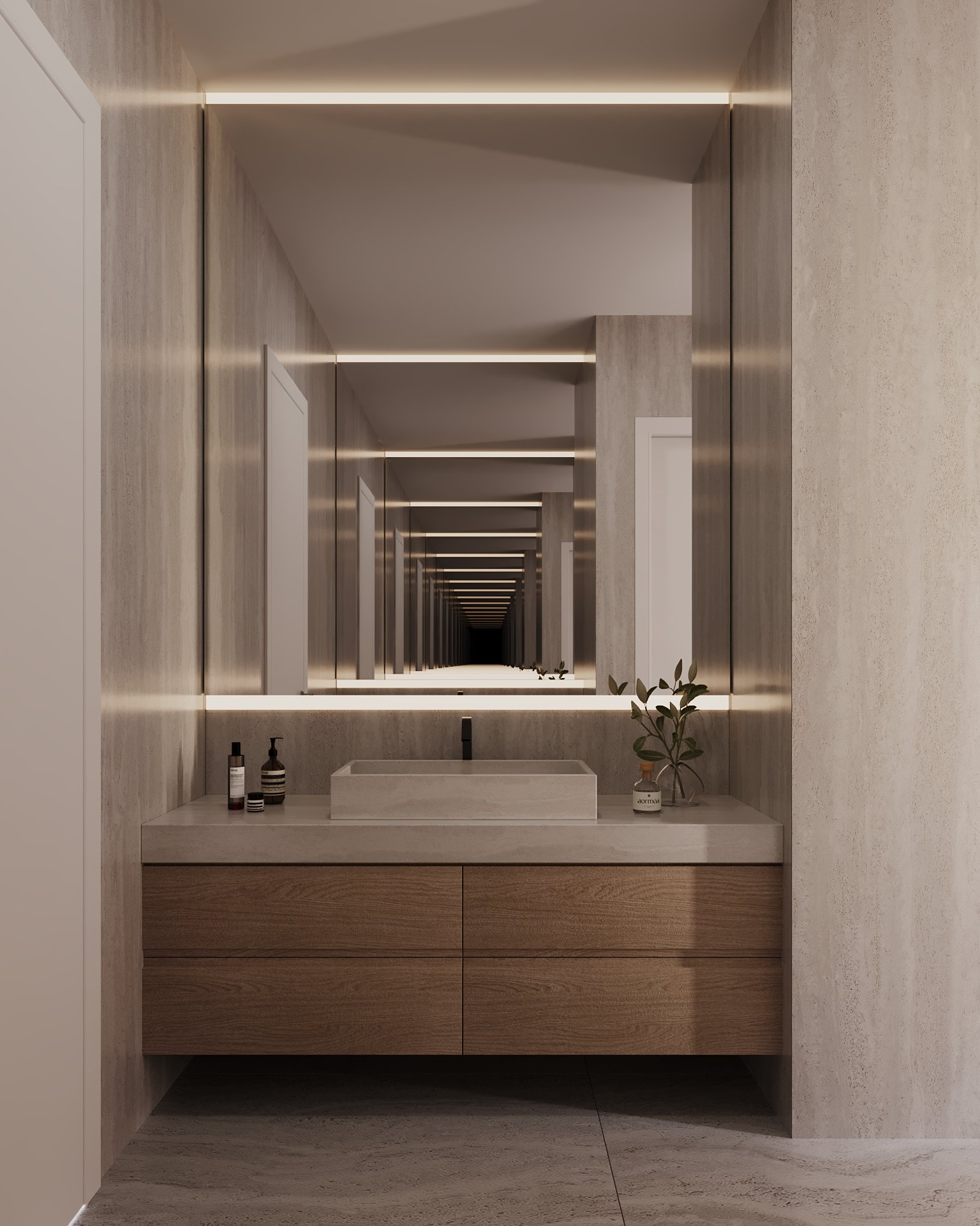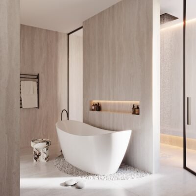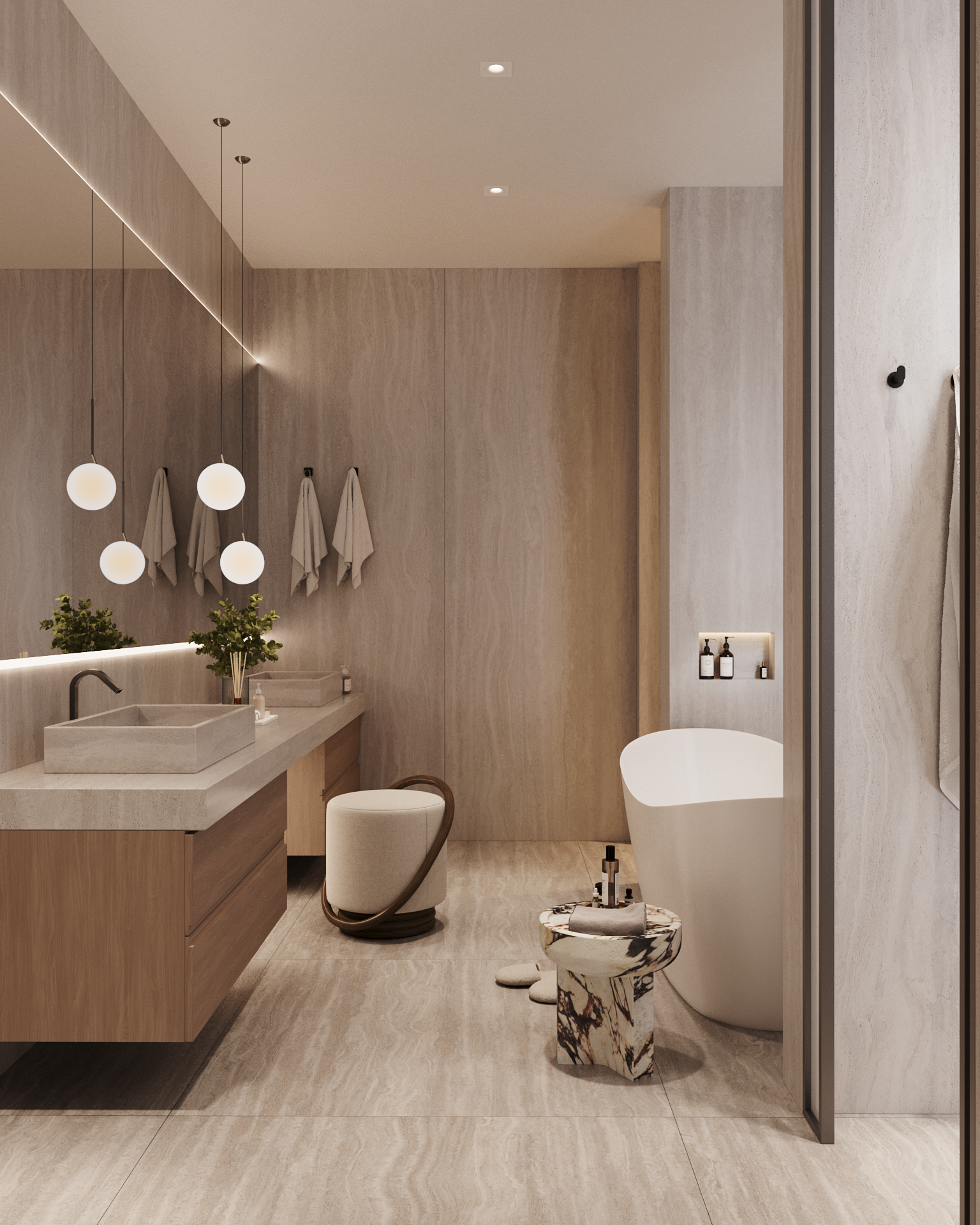The freestanding bathtub becomes the room’s sculptural centerpiece, positioned to capture soft natural light and invite moments of pure relaxation. Around it, natural stone surfaces and warm wood details bring organic warmth, while custom lighting highlights the architectural lines, creating an intimate, serene ambiance.