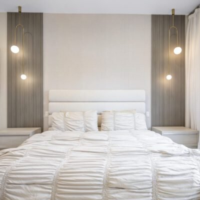 The upholstered headboard anchors the room with its sculptural form, while vertical slatted panels frame the bed, adding rhythm and depth. Soft brass pendants descend delicately, bringing warmth and sophistication to the composition.