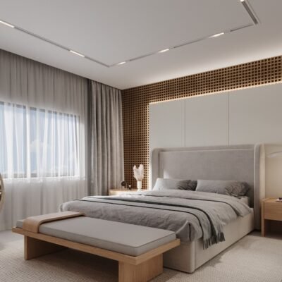 This master bedroom project was designed for a youngcouple seeking comfort and modernity. The custom-made cabinetry features harmonious tones, reflectingboth of their styles. The mashrabiya adds charm, while mirrors expand the space and serve as decorative
