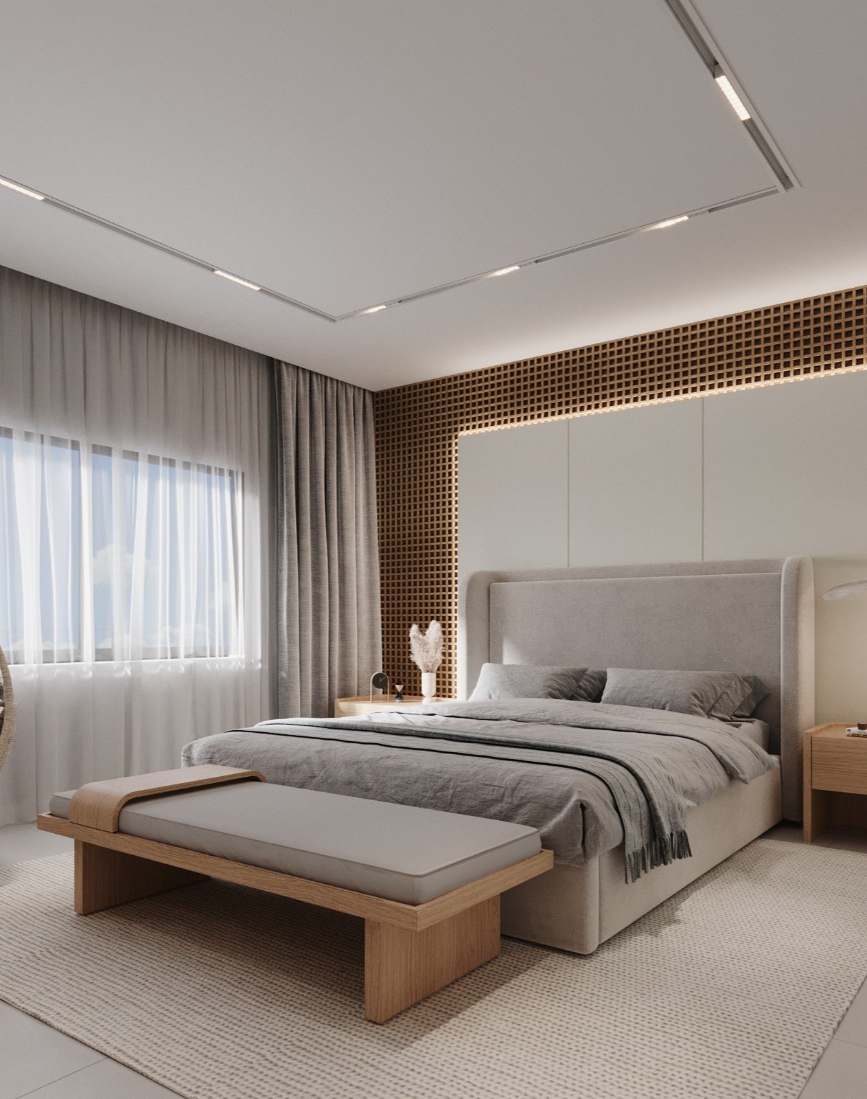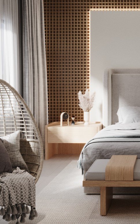 This master bedroom project was designed for a youngcouple seeking comfort and modernity. The custom-made cabinetry features harmonious tones, reflectingboth of their styles. The mashrabiya adds charm, while mirrors expand the space and serve as decorative