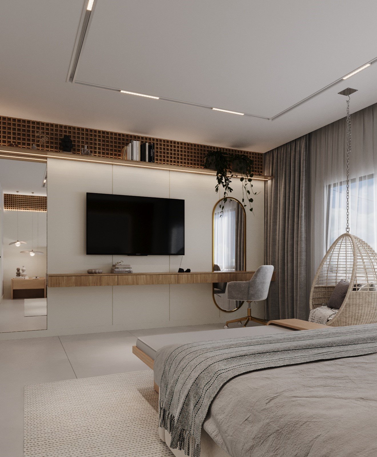 and functional elements. The TV cabinet is versatile,functioning as both a vanity and a work desk. Custom-made curtains dress the room elegantly. A swingintegrates perfectly into the design, and the lighting combines direct and indirect sources, creating a cozyambiance.