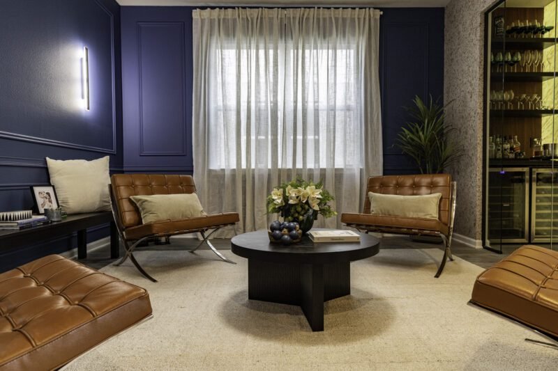 In this wine room, elegance meets warmth. The deep blue walls, accented with classic boiserie,