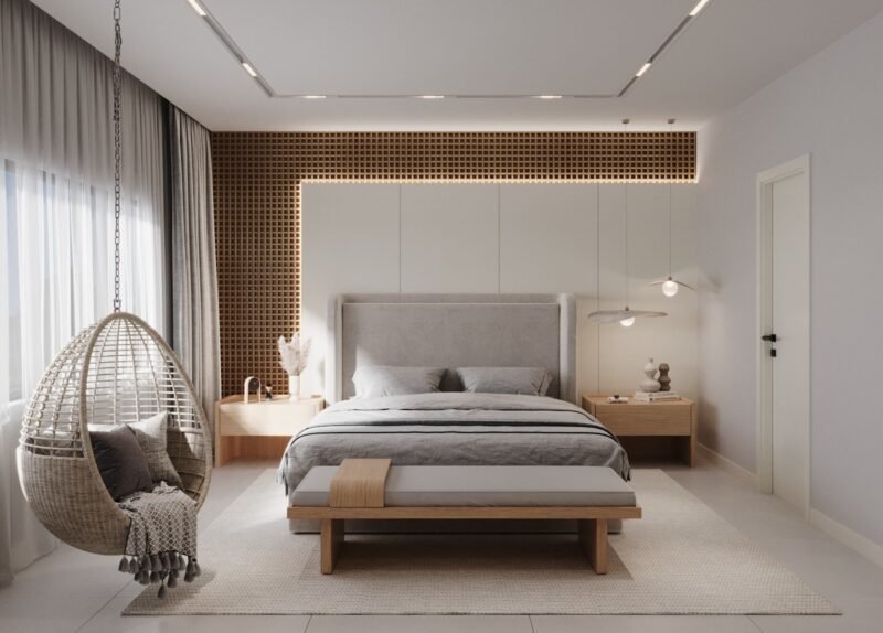 This master bedroom project was designed for a youngcouple seeking comfort and modernity. The custom-made