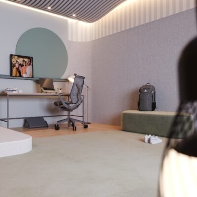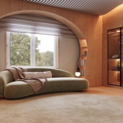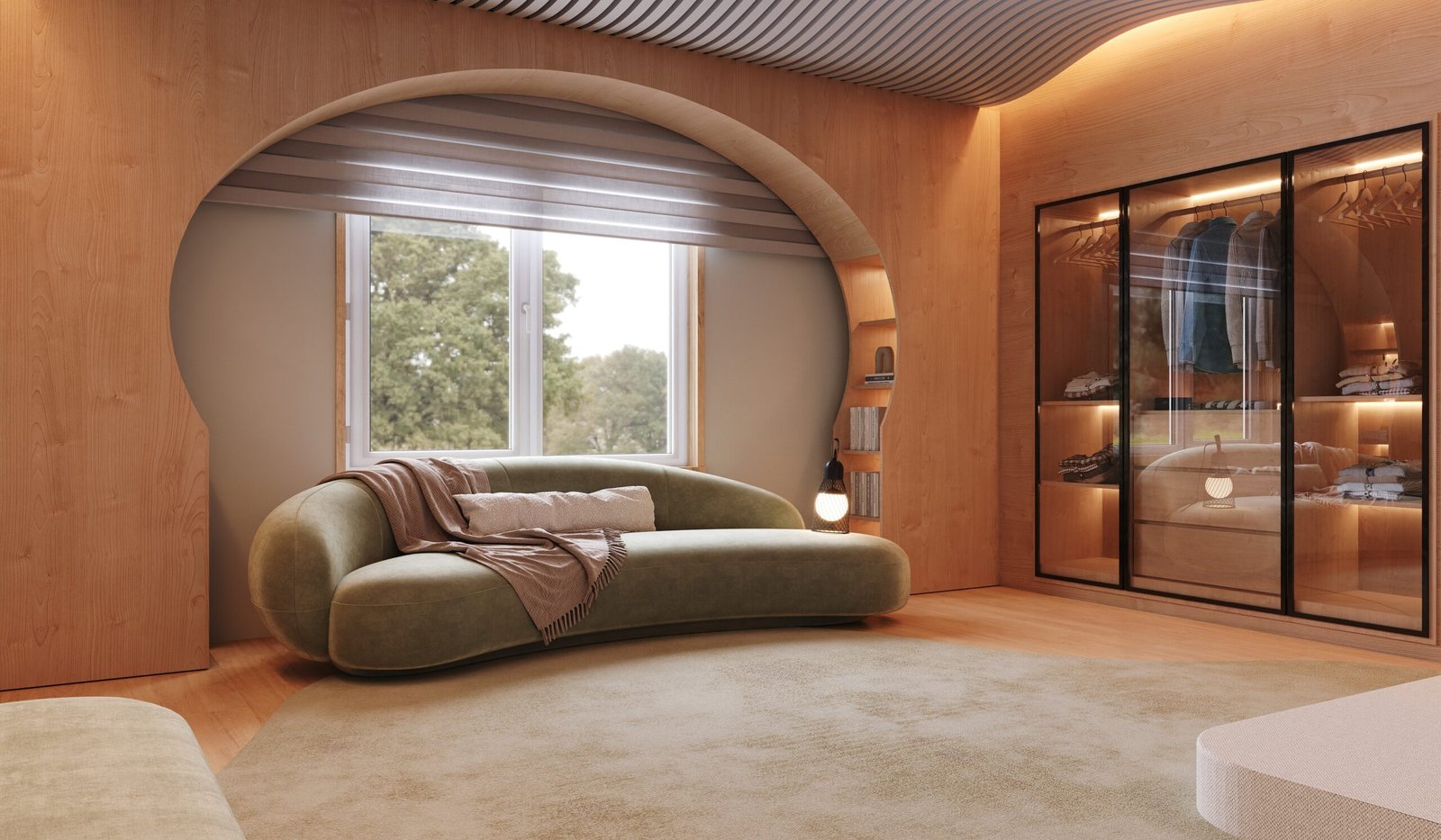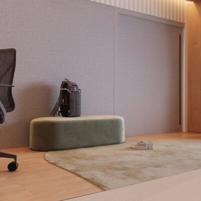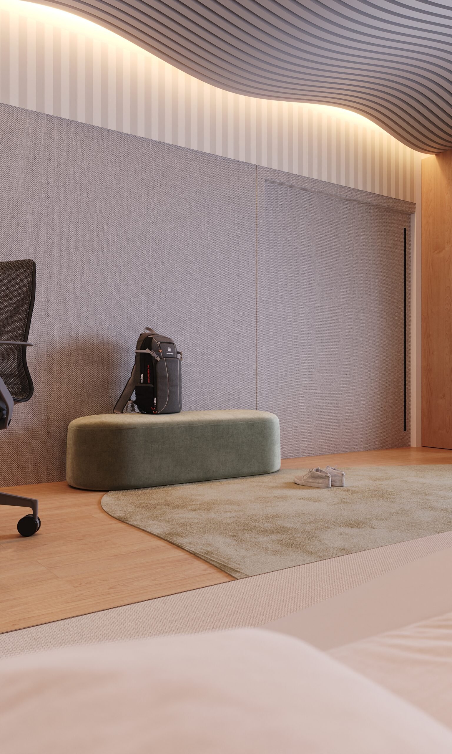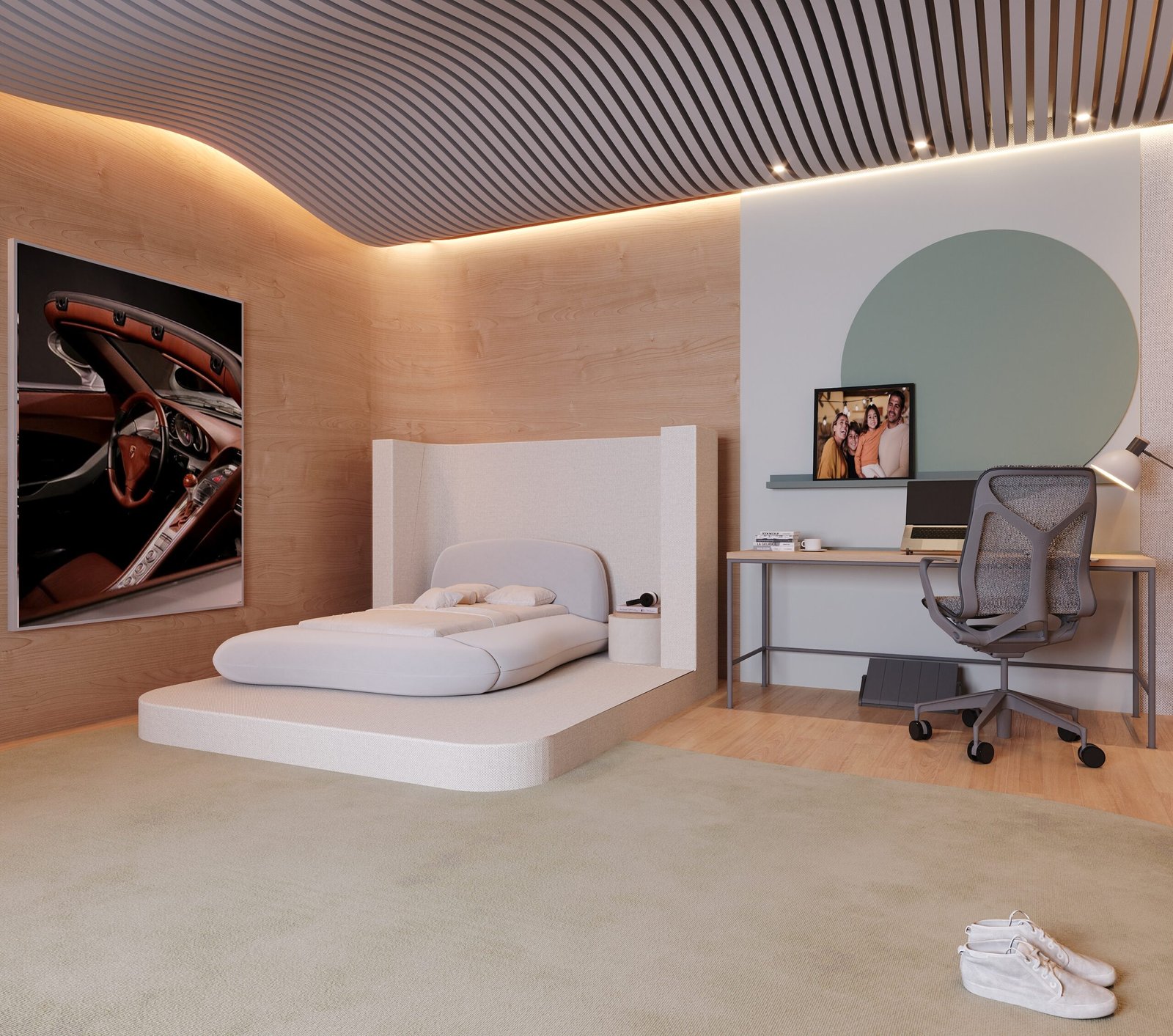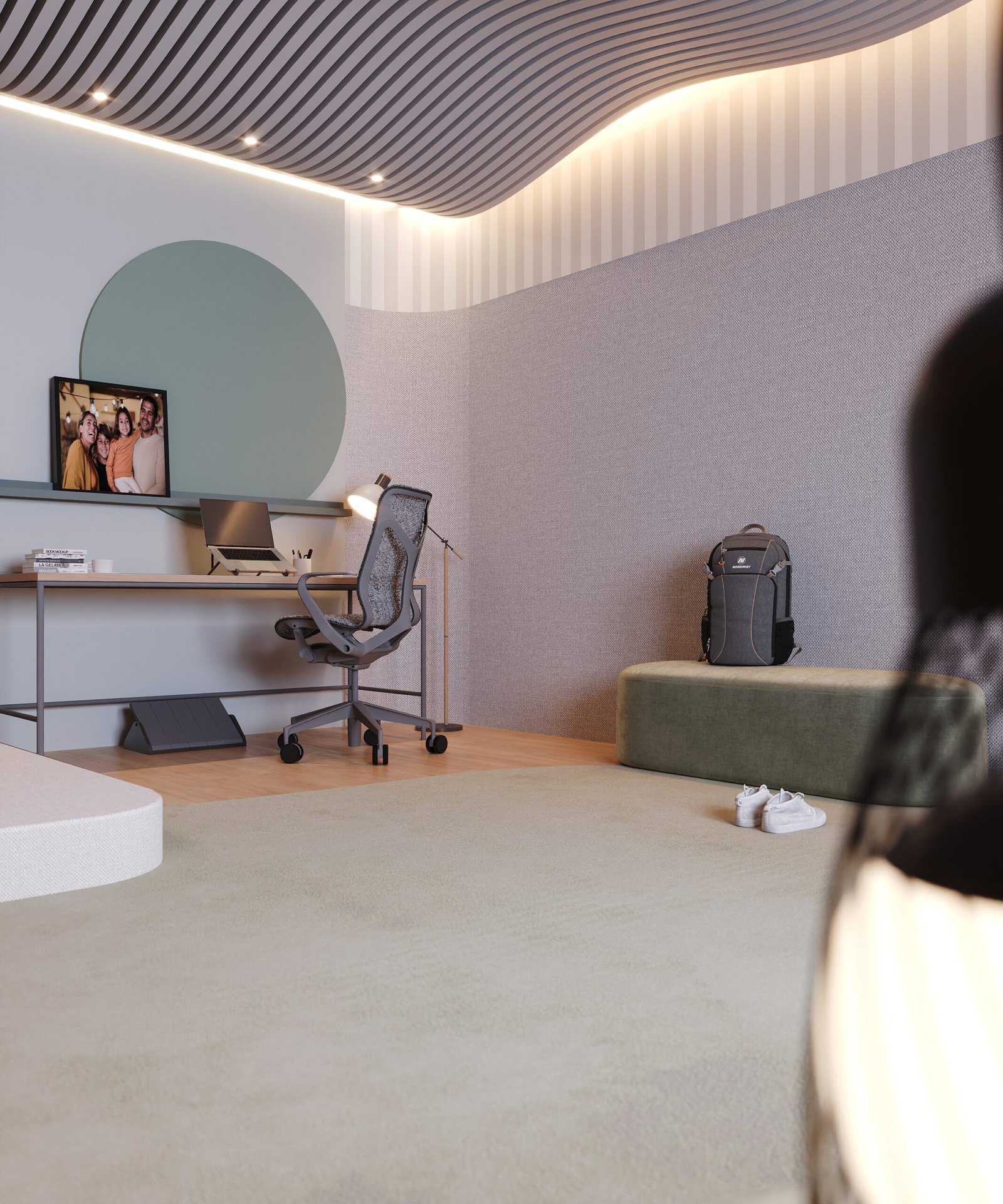This bedroom was designed to provide sensory comfort for the life of a young autistic person. The acoustic treatment on the ceiling and walls, combined with wood and carpet, reduces noise. The bed has an expanded padded headboard, blocking the view of the study desk and minimizing intrusive thoughts. A panel on the window accommodates and conceals shelves. Organic furniture softens visual stimuli, while the rectangular desk balances focus. Indirect lighting avoids blue light, and the sectorized layout promotes a sense of organization.