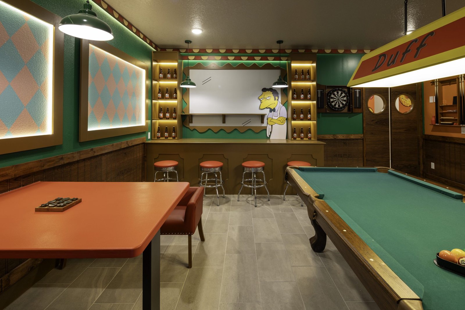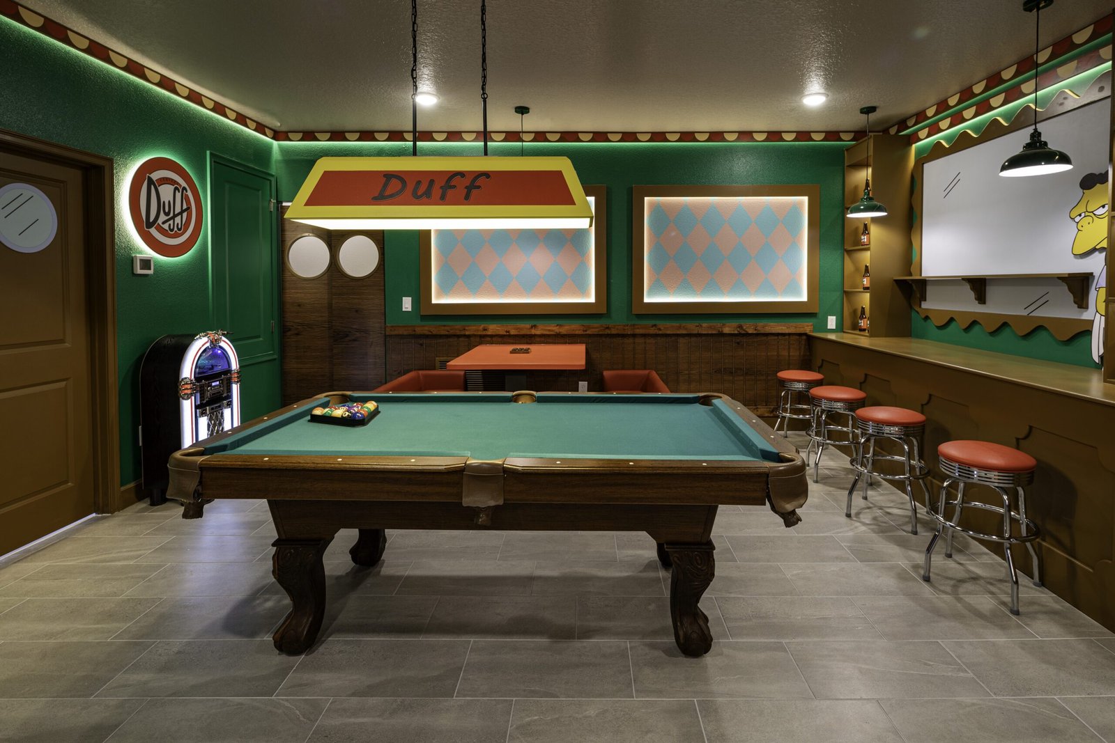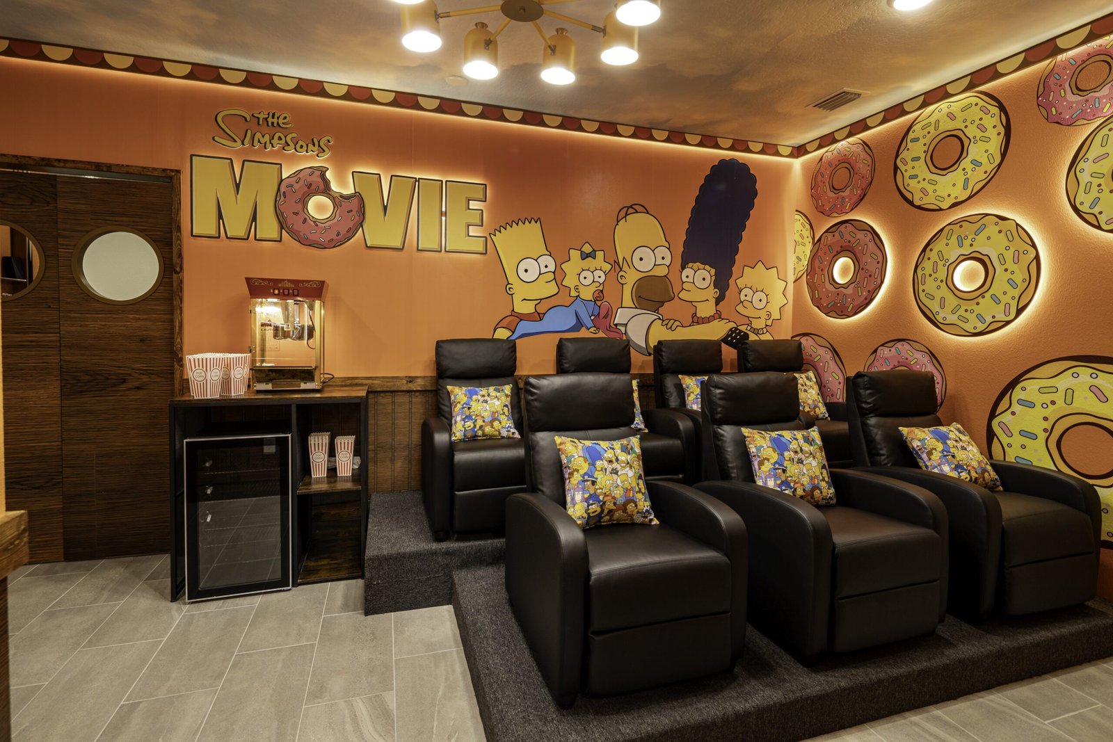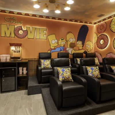Part of the space was designed for adults: the relaxed atmosphere of Moe’s Tavern comes to life with a pool table, bar counter, jukebox, and darts — a perfect setting for gatherings with friends and moments of laughter. Next to it, the private theater invites guests to a fully immersive cinematic experience, featuring ultra-comfortable seats, a high-definition illustrated panel, scenic lighting, and personalized décor that evokes both nostalgia and warmth.