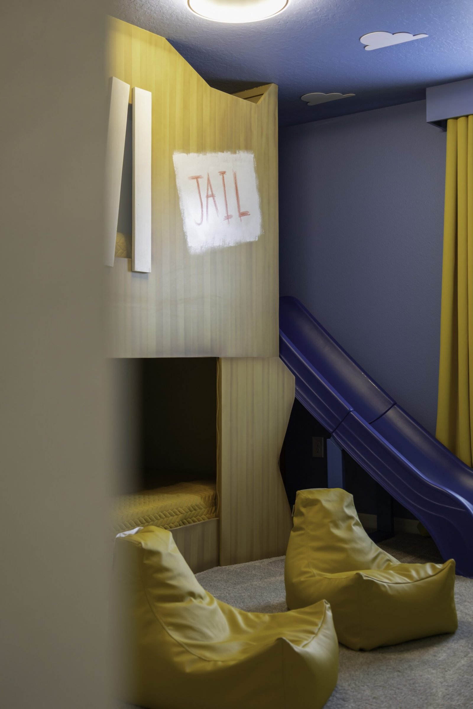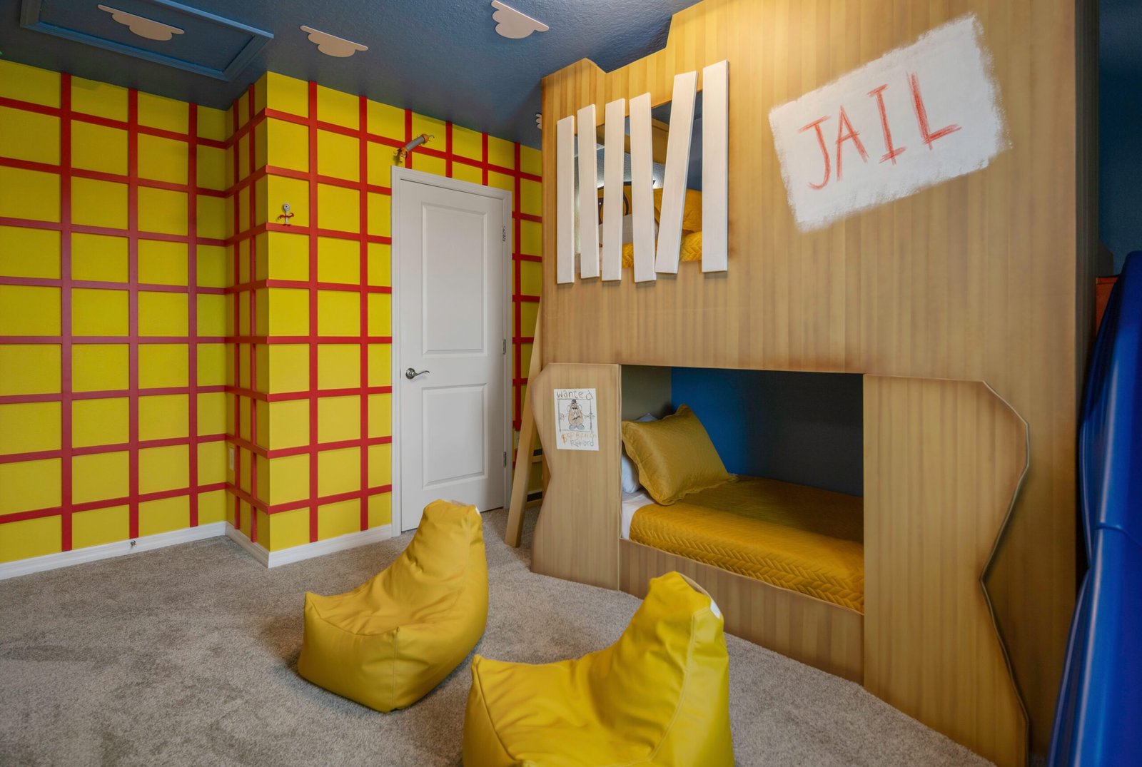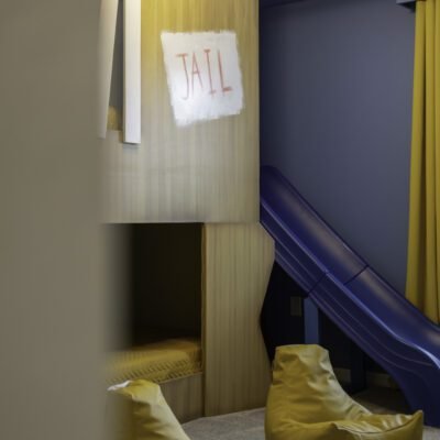 At the center of the room, the custom-designed “Jail” bunk bed is hand-painted to resemble stacked cardboard boxes, complete with a slide and climbing wall, transforming the space into a playful stage for endless adventures. The design incorporates interactive elements, such as a TV wall inspired by giant building blocks in primary colors – red, yellow, green, and blue – adorned with small figurines, turning entertainment into part of the narrative itself.
