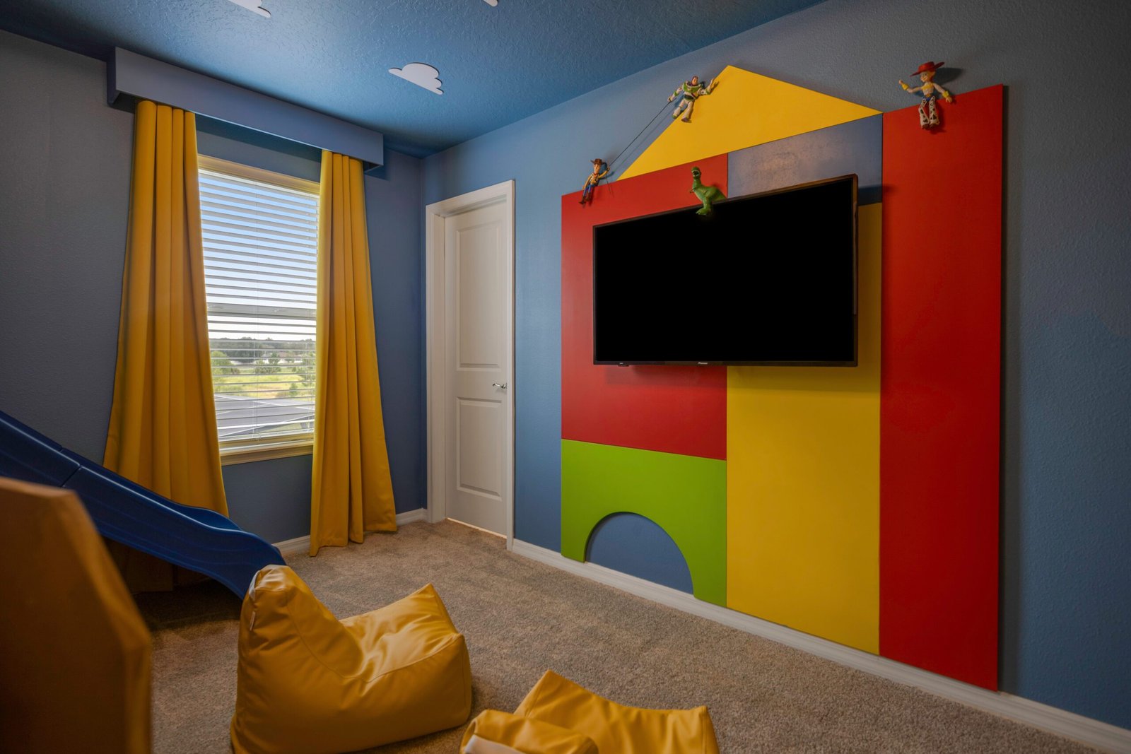 A sky-toned ceiling dotted with white clouds, bright yellow curtains, and carefully designed lighting enhance the immersive atmosphere, while vibrant wall colors and red grid detailing pay homage to Andy’s iconic shirt, delighting fans of all ages. Every corner encourages creativity, play, and exploration, making the room not only visually stunning but also highly functional. The result is a vibrant, interactive, and character-filled environment – a perfect example of how thoughtful interior design can beautifully turn fantasy into reality.