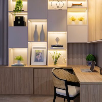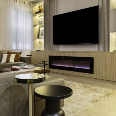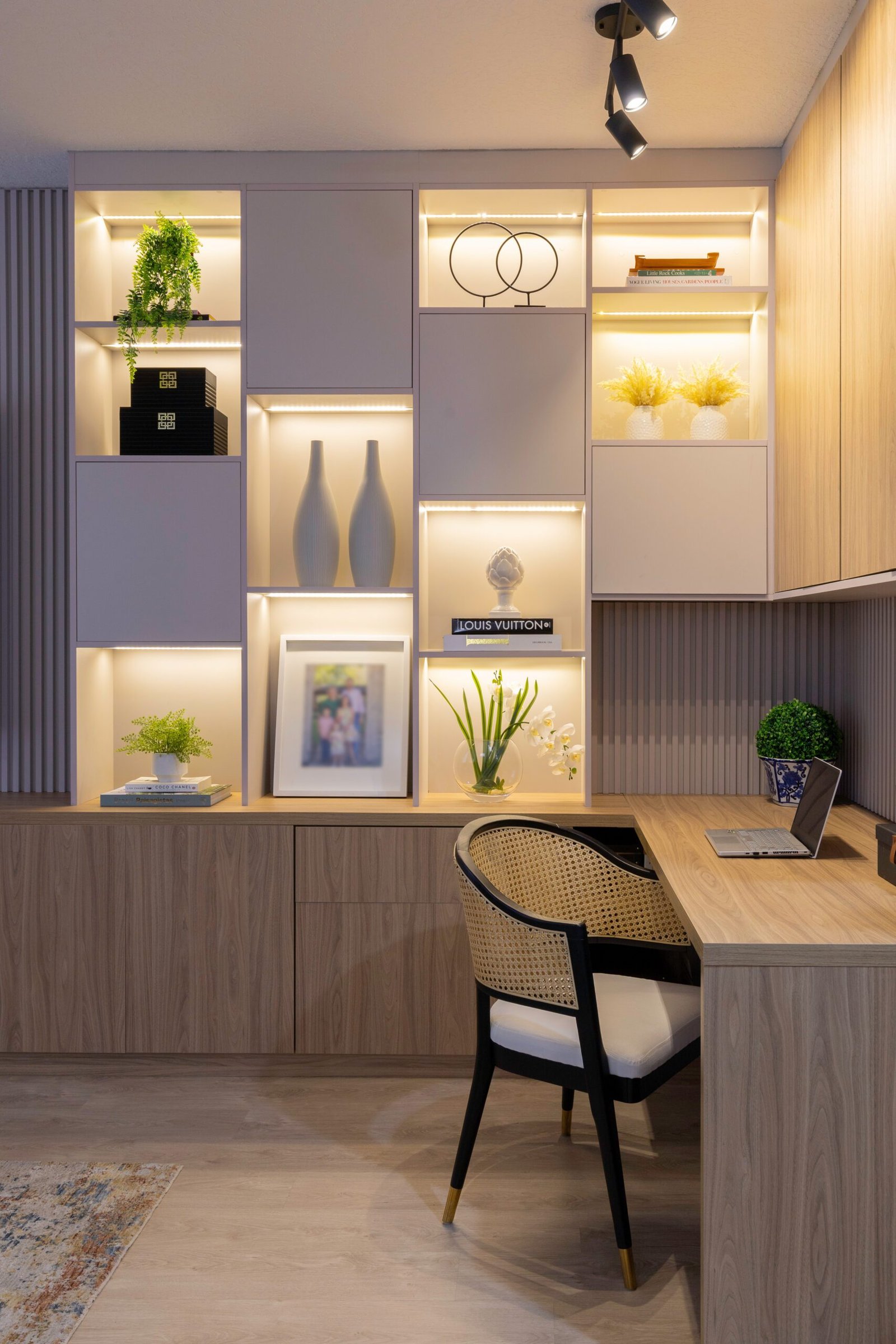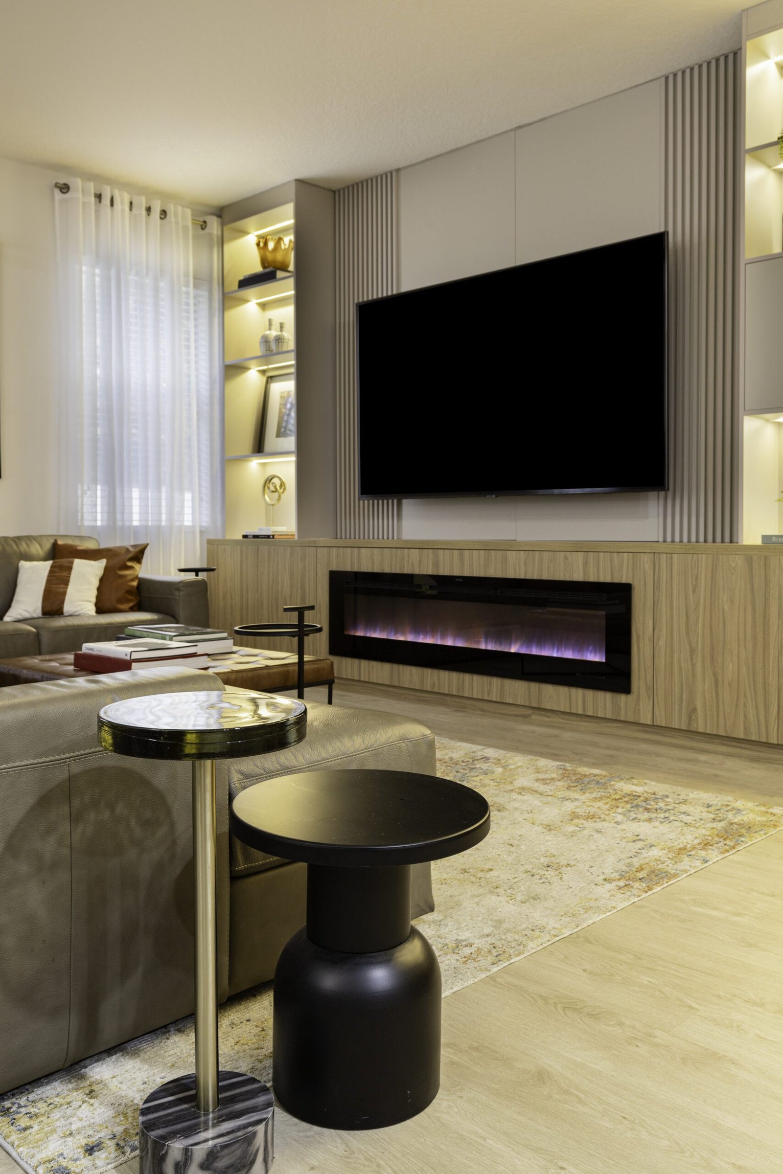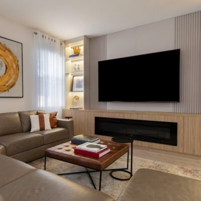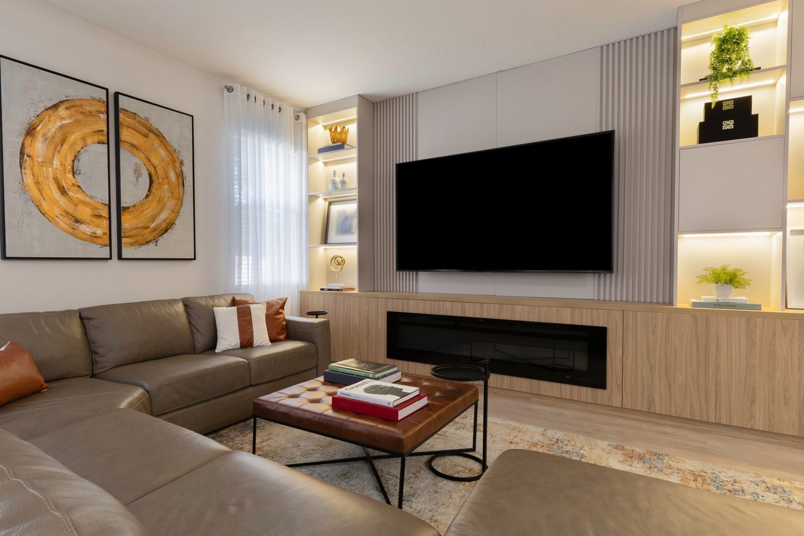 The goal of this project was to combine the essential comfort of an inviting TV room and add space for a home office. As a focal point of the space, we designed custom-made cabinetry, in neutral and woody tones and LED lighting on the shelves, optimizing every inch of the spatial configuration. The upholstered coffee table, the Italian leather L-shaped sofa, along with the strategically selected accent tables and the home office rattan chair, provide a modern and timeless aesthetic to the project.
